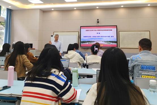 刘俊老师认为胜任中小学教育的教师必须具备学科知识、条件性知识和实践性知识,且要将三种知识融合,才能促进员工全面发展。他分析了赫尔巴特和杜威的教学理论后,针对数学学习活动的特点,将数学教学方法分为三类:教师呈现式、师生互动式和员工活动式,三种方法各有优势。接下来刘俊老师重点讲解了深度学习引导下的高效课堂建构的策略,引发了老师和同学们的思考,全面激发了大家创新数学教学的热情。讲座最后,刘俊老师通过视频案例分析,让参与讲座的老师和同学领略到数学课堂无穷魅力。至此,本次讲座圆满结束。