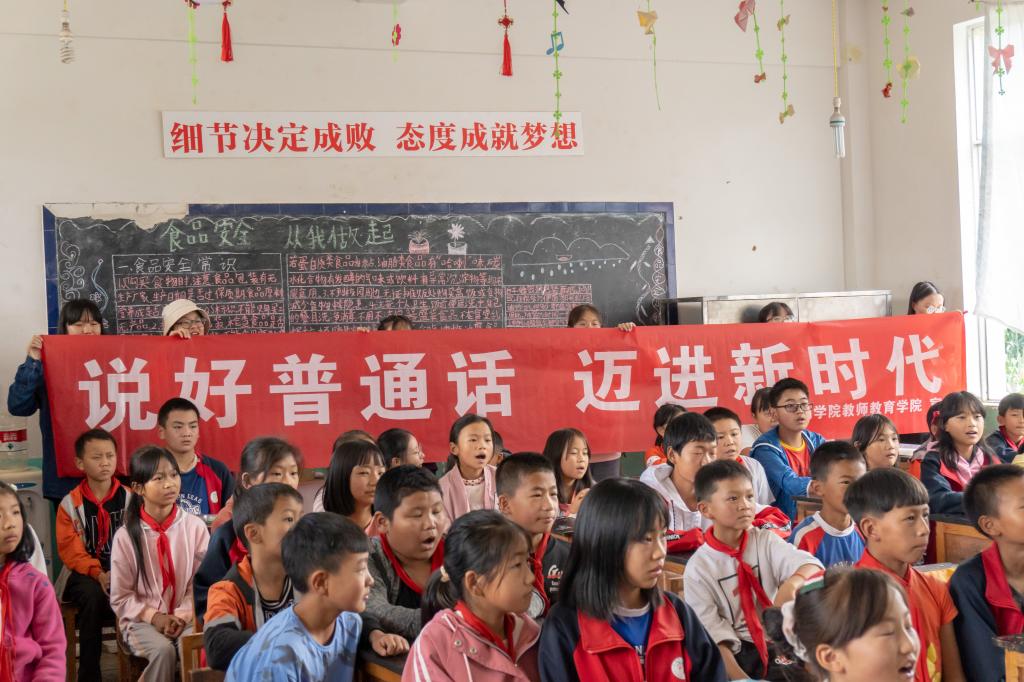 2021年7月8日,团队内师生们到达文林村小学。同文林小学董事长进行沟通,告知来意后,开始参观文林小学、调查文林小学的团队力量和在校的员工人数以及近几年文林小学的发展情况,深入了解乡村小学教育状况及水平。并和文林小学的小员工们进行学习和生活上的交流,辅导他们的假期作业,了解员工学习情况;最后,通过玩小游戏等丰富多彩的方式向小员工推广普通话,认识到学习普通话的重要性。